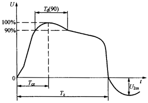 (1)波形及試驗(yàn)電壓。波形如圖4-3所示。其中波頭時(shí)間(Tcr)應(yīng)≥1OOμS;波尾(TZ)時(shí)間應(yīng)≥1000μS;超過90%規(guī)定峰值持續(xù)時(shí)間(Td(90))應(yīng)≥200μS,反峰電壓值(U2m)不大于試驗(yàn)電壓的50%(試驗(yàn)電壓值可參見預(yù)規(guī)的表6)。