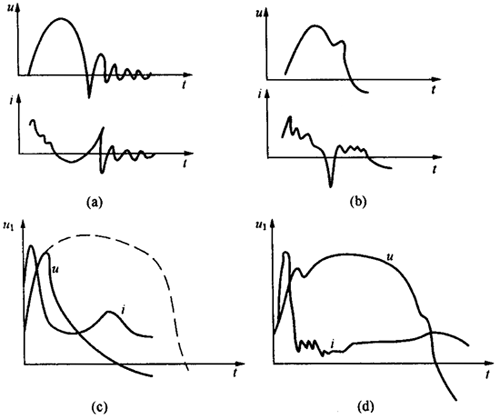 對(duì)匝間發(fā)生火花放電的情況,由于火花熄滅使電壓下跌又回升,形成一個(gè)凹陷,電流在對(duì)應(yīng)點(diǎn)有振蕩,整個(gè)波形無明顯變化,如圖4-9(d)所示。