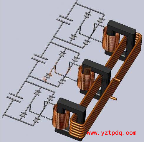 多變壓器共初級(jí)次級(jí)級(jí)聯(lián)方式的電路示意圖如下圖所示。為了能看的直觀一些,這里畫了一張3D的圖紙,為了畫出這個(gè)示意圖,畫了好長(zhǎng)時(shí)間,特別是初級(jí)的那個(gè)線圈,看上去簡(jiǎn)單,很費(fèi)了一番力氣!這種結(jié)構(gòu)的特點(diǎn)是多個(gè)變壓器組合,初級(jí)為串聯(lián)結(jié)構(gòu),次級(jí)獨(dú)立整流以后再串聯(lián)。優(yōu)點(diǎn)是:適合大功率的輸出,變壓器的升壓比不大。缺點(diǎn)是:初、次級(jí)對(duì)磁芯之間總有一個(gè)絕緣要求高,需要多個(gè)變壓器。